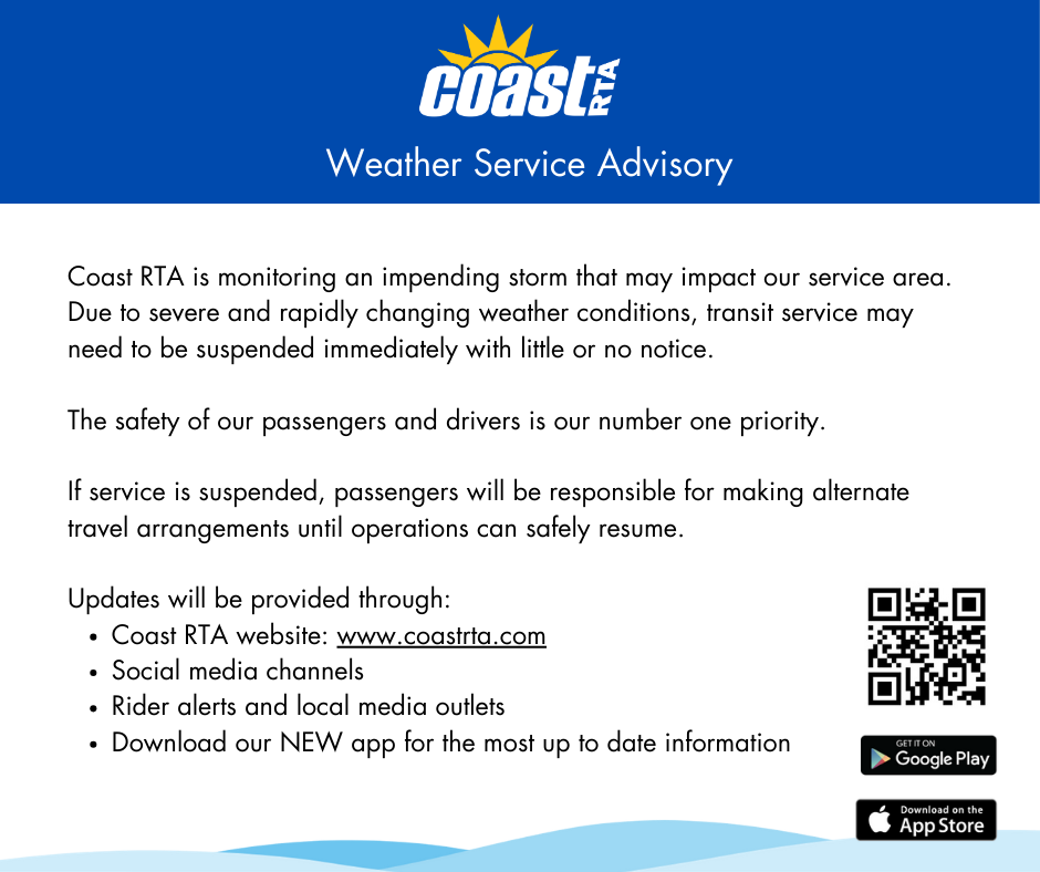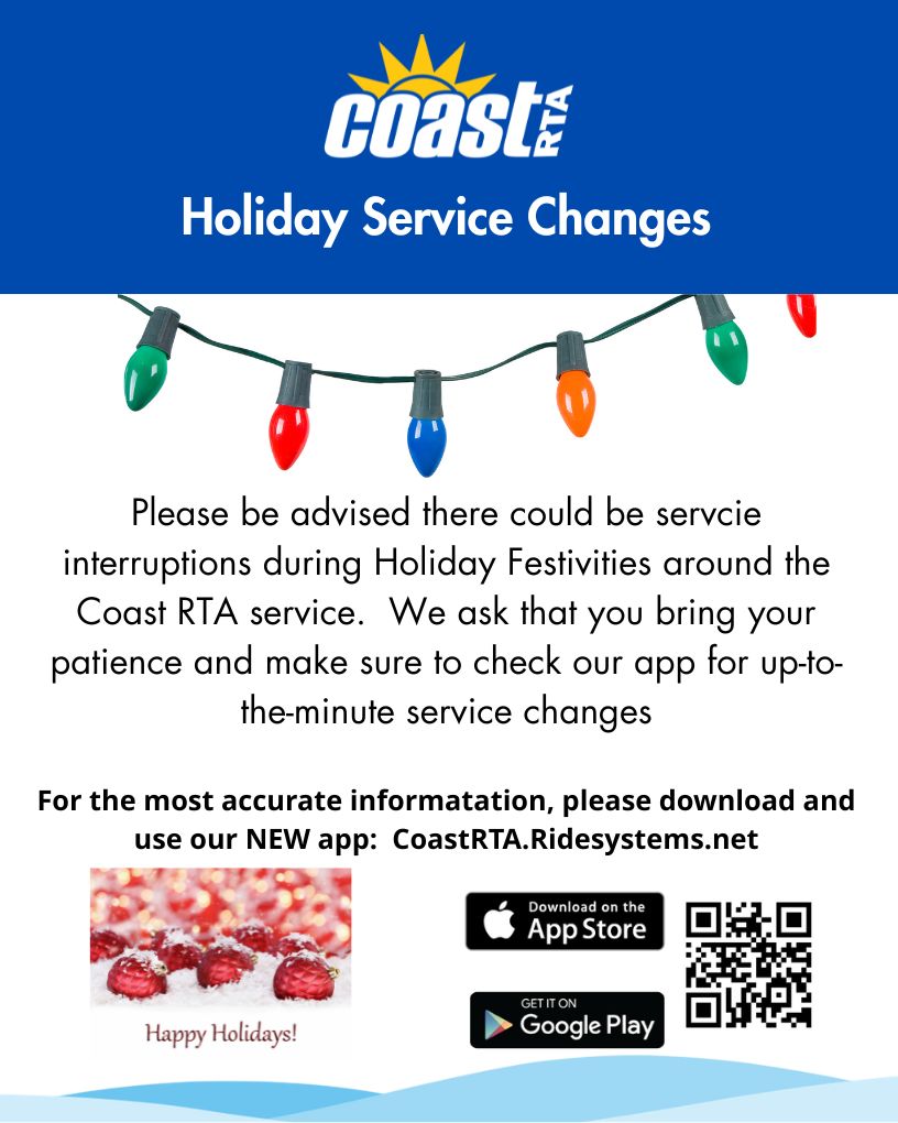 Need to know how to get from here to there? Look no further than our detailed Coast RTA maps and schedules to help you get on your way fast. Track your bus with the Coast RTA App!